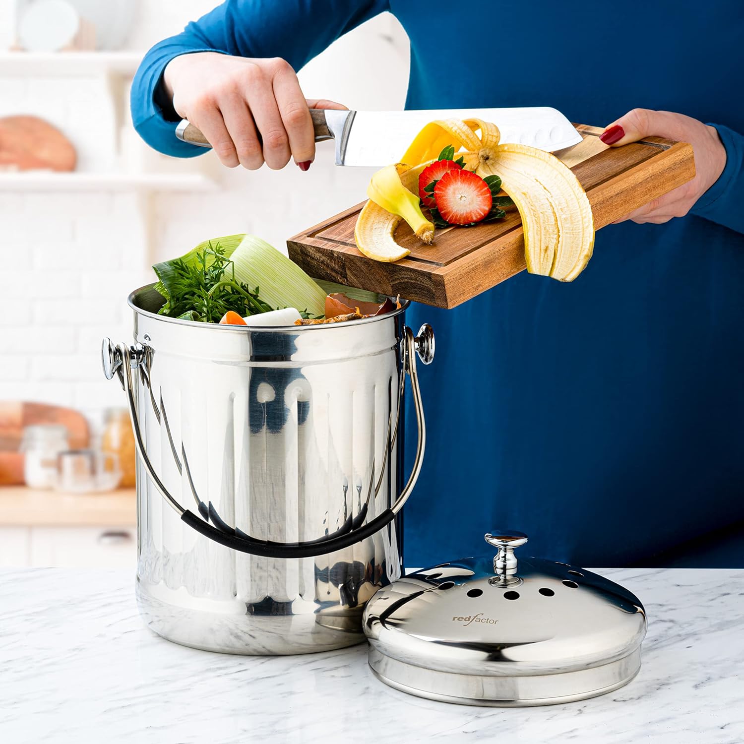 - Completely Odorless β You can keep adding food scraps (such as fruits, vegetables, coffee grounds, egg shells, tea bags etc.) to this kitchen compost bucket without worrying about any bad smell. Unlike other kitchen food containers, this RED FACTOR food waste container is equipped with innovative dual-filter technology with active carbon ingredient and a lid with holes for proper ventilation, neutralizing bad smells even in hot summer days.