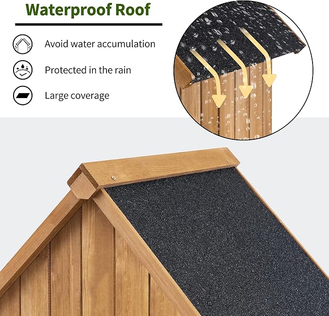 - Waterproof Roof: The sloping roof is covered with asphalt, ensuring waterproofing and preventing water buildup; This design extends the life of the shed by protecting it from the elements