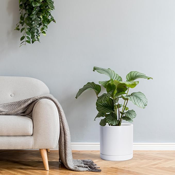 D'vine Dev 8.2 Inch & 10 Inch Ceramic Planter Pot for Plants with Drainage Hole and Saucer, Large Plant Pots Set, White, 94-G-L-1