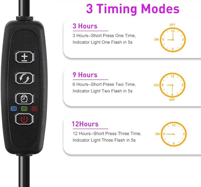 - 【Timing Fuction】Plant Grow lights with an automatic timing function is the latest in plant growth lamps . Not only you can set it up for lighting every 3 hours, 6 hours or 12 hours, but also you can adjust the distance between the light and plants, according to plant needs. Note: We suggest that please adopt the adapter for USB Plug require under 3A (No Adapter)