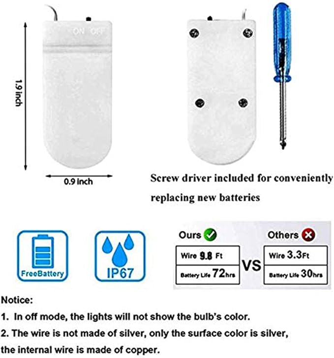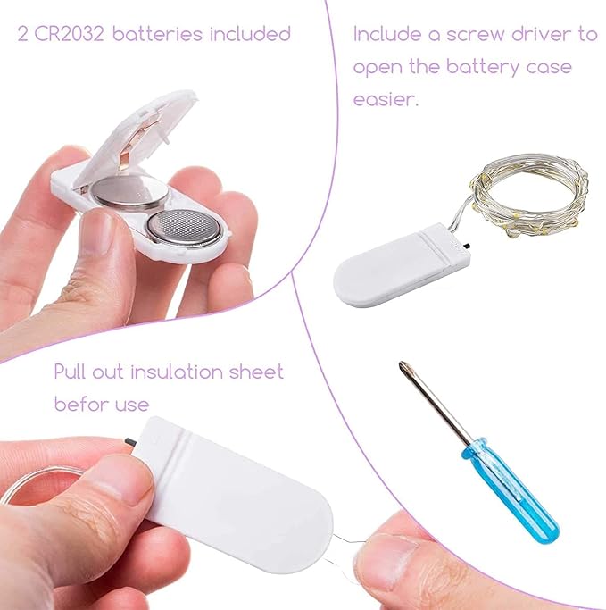 - 8 Purple Colors in One Package: The package including 8 Pack Purple 30 led fairy lights are made of high quality 10 feet long flexible silver wire. 2 x CR2032 batteries per lights and a screwdriver included, 48 hours of battery life. Just use the attached little screw driver to change batteries while itโs out of power.
