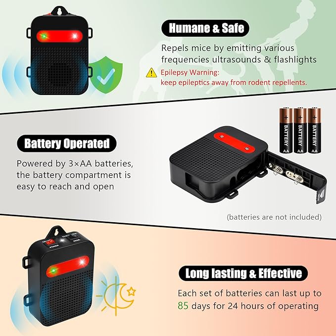 - Repels rats, mice, rabbits, martens, sables, cats, chipmunks and other destructive rodents out of the coverage area