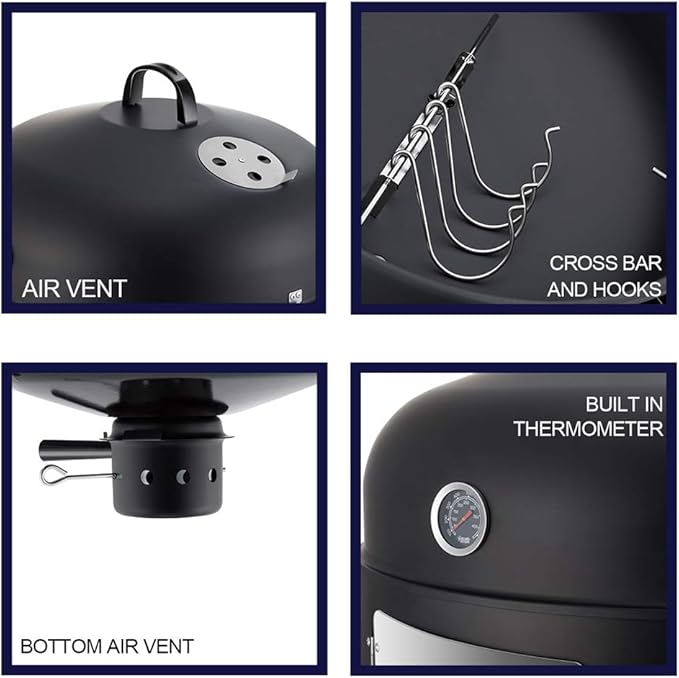 - [SPECIAL BOTTOM VENT DESIGN] - Built-in thermometer, Realcook charcoal smoker with special bottom damper and ash collector, which is easy to control the bottom air flow to maintain a steady temperature inside the smoker,easily removes the ash cup and dumps ashes in seconds.