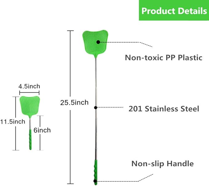- LONG EXTENDABLE POLE: Flyswatter boasts a long extendable pole made from Stainless steel, which is durable and sturdy . It may reach 25 inches in length and no flies will escape even in far.