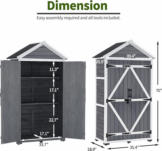 - Space-Saving Large Shed: This tall, compact wood shed is ideal for hiding messy garden tools without taking up too much space; Suitable for gardens, patios, decks, porches, or garages, it provides ample storage in a compact footprint; Dimensions: 35.4" (L) x 18.9" (W) x 70" (H)