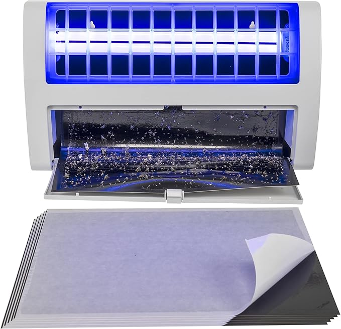 - [Safe and Eco-Friendly Design] - The lamp utilizes the LED UV black light to attract pests to the lamp because of the irresistible light, which then captures the pests onto a sticky glue board. The glue boards are coated with a special non-toxic attractant that is safe to use. Glue boards should be replaced every 1 to 2 months for most effective results.