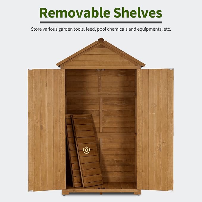 - Space-Saving Large Shed: This tall, compact wood shed is ideal for hiding messy garden tools without taking up too much space; Suitable for gardens, patios, decks, porches, or garages, it provides ample storage in a compact footprint; Dimensions: 35.4" (L) x 18.9" (W) x 70" (H)