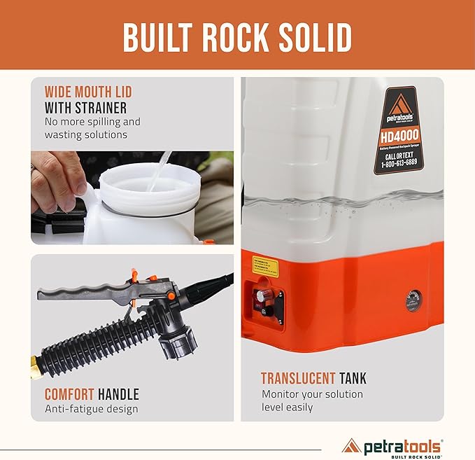 - American Family-Owned Company & 24/7 USA Support: Since 2019, PetraTools has been turning customers into fans with the durable, and long-lasting performance of our battery back pack sprayer 4 gallon. Backed by 100% customer satisfaction, we are ready to assist you 24/7.