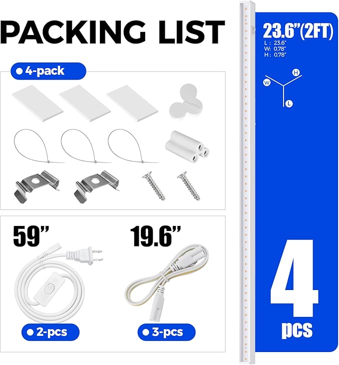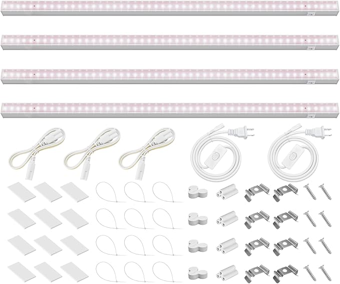 - What You Get: 4 x Barrina T5 Grow Lights, 2 x Power Cords with ON/OFF Switch, 3 x Connecting Cords(20''), 4 x Small Connectors, 8 x Installation Clips, 12 x Double-sided Tapes, 12 x Cable Ties