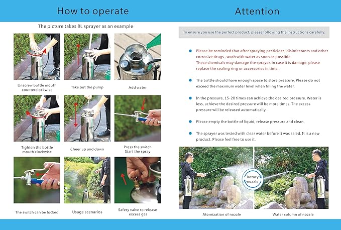 - Versatile: Practical compression sprayer for indoor and outdoor use. Compatible with most commercial liquid fertilizers. Widely used in horticulture, indoor and outdoor spraying, and disinfection.