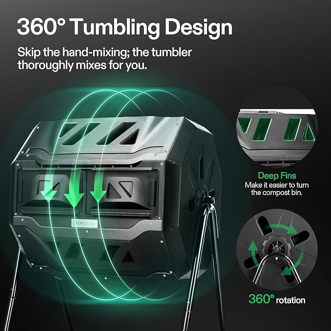 - 360β° Tumbling Design: The rotating design prevents you from digging or mixing the pile by hand; And the deep fins on eight panels make it easier to turn the compost bin