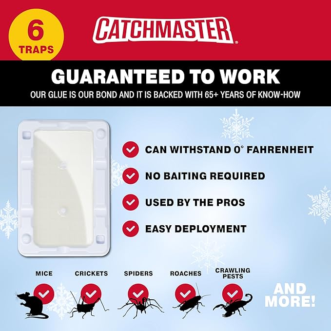 - WINTER WEATHER PROTECTION: Cold Weather Catchmaster Glue Traps for Mice & Insects can withstand 0ยฐ Fahrenheit. Use the mouse traps outdoor in unheated garages or basements during cold winter months & in commercial walk-in refrigerators where "regular" glue traps are ineffective. Trap is effective for up to 1 year when stored in the box or kept clean of dust & debris.