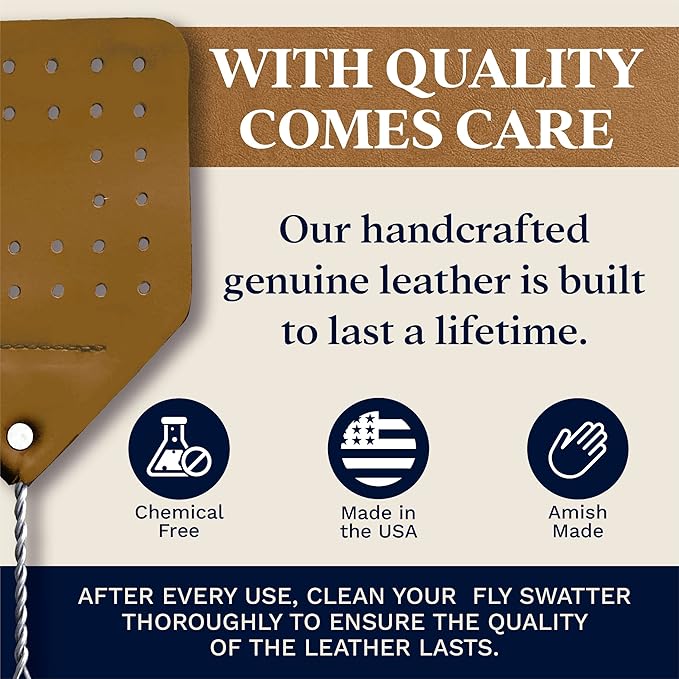 - Heavy-Duty Leather Paddle: This durable large fly swatter is handmade by Amish artisans using premium leather. The giant fly swatter also has a thick leather handle cover that’s bound to the spring-steel handle with a brass rivet. Our Amish big fly swatter will stand up to the biggest bugs and produce a powerful swat.