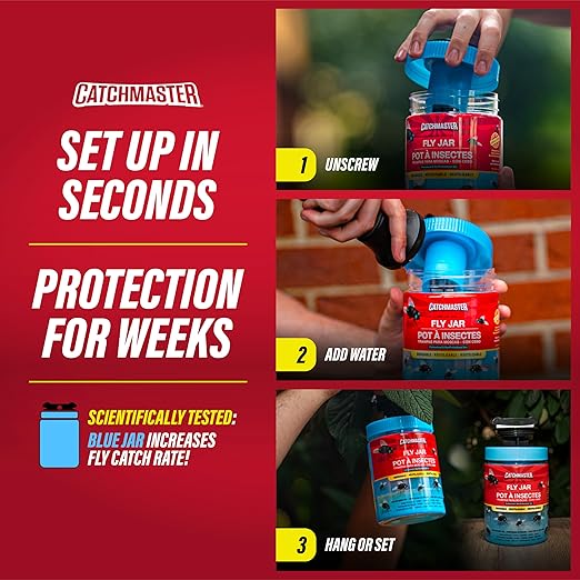 - ATTRACT AND KILL: Catchmaster's Fly Jar features a specially formulated powerful fly attractant that will attract a broad range of species, including house flies, blue & green bottle flies, flesh flies, blowflies, and many more pests. The food based lure is long lasting and can catch thousands of flies! Use our reusable flying insect trap for pest control management around your home and yard.