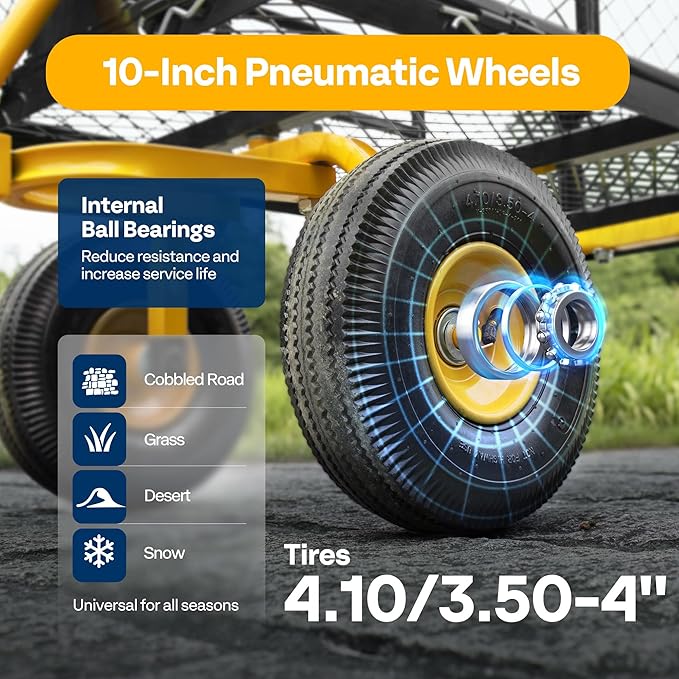 - NOISE REDUCTION TIRES - The load-bearing, shock-absorption, and noise- reduction of the cart are all determined by the casters; The pneumatic tires have good elasticity, impact resistance, and noise reduction; Compared with small wheels, large wheels are able to adapt to various road conditions and have good load carrying advantages; PLEASE BE AWARE that the tires are not fully inflated due to safe transport consideration