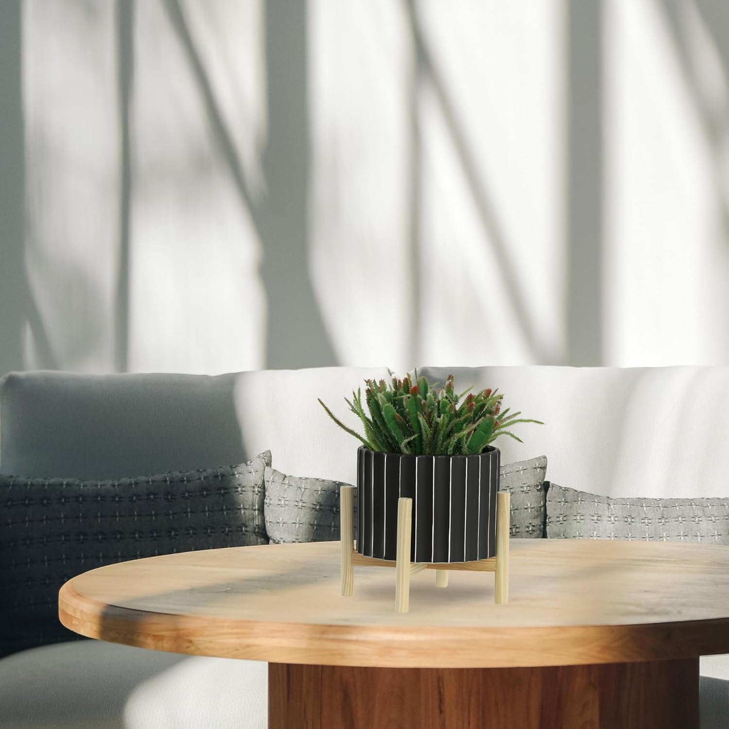 • Sleek Modern Style: This 9" black ceramic planter with vertical fluted design and pine wood stand adds bold elegance to contemporary, minimalist, or bohemian-inspired home decor.