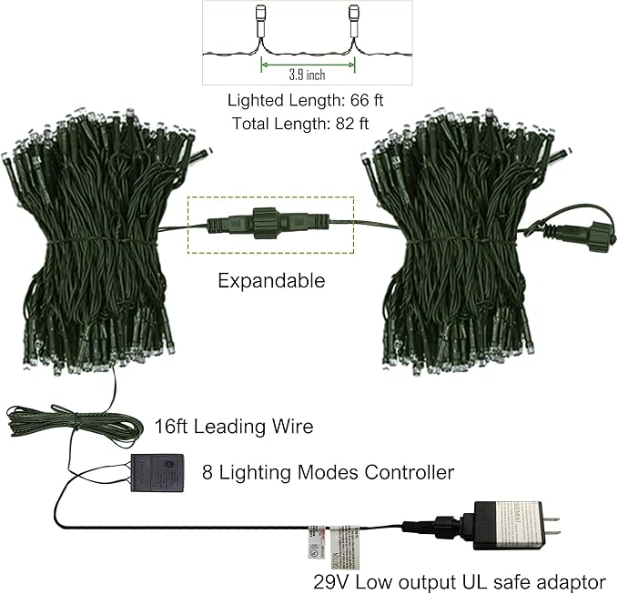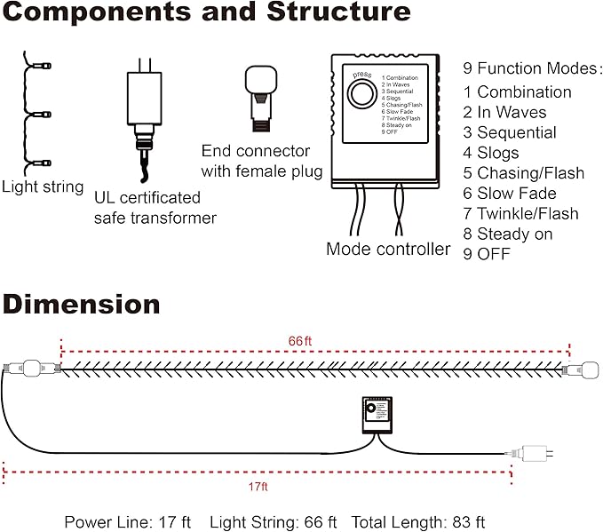 - 8 Mode Functions- 8 Mode Functions to fit different occasions, moods, feelings, holidays, festivals, anniversaries, etc. (Combination, In waves, Sequential, Slow Glow, Chasing/Flash, Slow fade, Twinkle/Flash, Steady on). Adjust the lighting modes by pressing the round button on the mode controller.