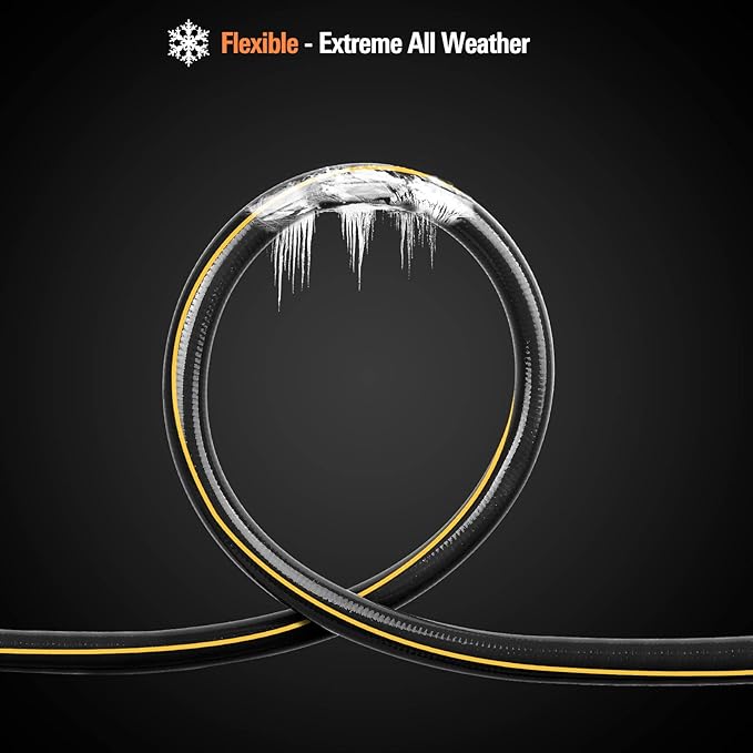 - Ultra Flexible & Lightweight:This garden hose is constructed from a newly patented material that renders it lighter than conventional hoses; Its ultra-lightweight design allows for easy maneuverability around the yard, as well as convenient rolling and storage in compact spaces; It offers exceptional flexibility in all weather conditions, withstanding temperatures ranging from -40°F to +150°F