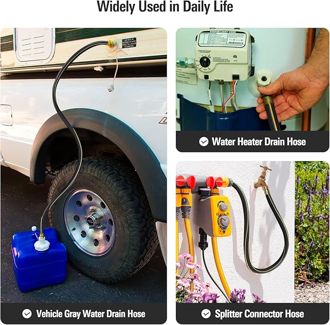 - Multifunctional: Available in various sizes, this product is ideal for a wide range of applications, including hose reel carts, RVs, dehumidifier hoses, laundry tub hoses, water softeners, washing machines, rain barrel drain hoses, short water hoses for pool cover pumps, and drain hoses for fishbowls and sinks; It effectively directs water to your bucket while minimizing splashing and mess