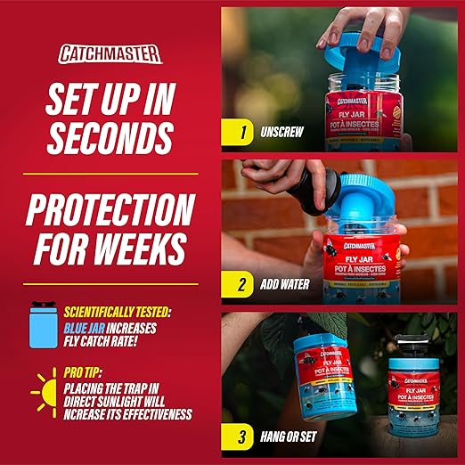 - EASY TO SET AND REUSABLE: The Fly Jar is easy to set for fly-catching action. Simply unscrew the cap and add warm water up to the line with the fly bait inside. Screw the cap on and place the trap outdoors in your desired location. Fly Jar traps are reusable. Once the jar is filled with the bugs, empty the contents, add fresh bait and water and you are good to go! Refill baits are available for sale.