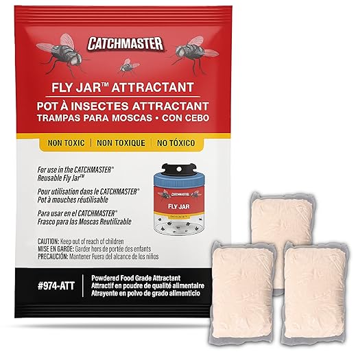 - ATTRACT AND KILL: For use in the Catchmaster Fly Jar, the Fly Jar Attractant features a specially formulated powerful formula that will attract a broad range of species, including house flies, blue & green bottle flies, flesh flies, blowflies, and many more pests. The lure is long lasting and can catch thousands of flies! This pack includes 3 Refill Baits for our Fly Jar. The flying insect trap jar is sold separately.