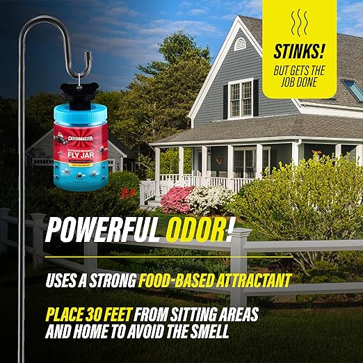 - SAFE AND NON TOXIC: Our innovative non-toxic fly bait is a safe home defense pest control option to use around pets and children. This powerful bait has a scent that flies will love (that’s the point) but isn’t ideal inside a house. Keep it outdoors, hang it from a tree, use it for a stable fly trap, or anywhere else flies belong! The Fly Jar can be placed on the ground or hung a few feet off the ground.