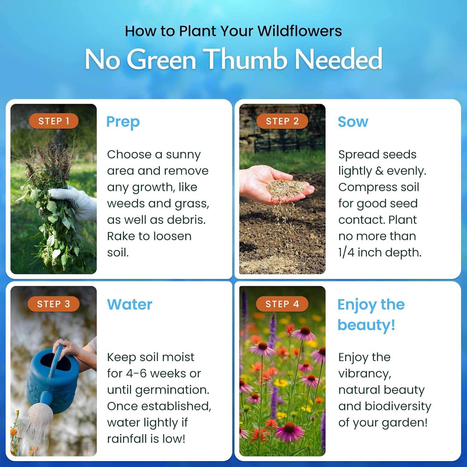 - EASY TO GROW & LOW MAINTENANCE: Simply scatter the wildflower seeds in full sun or partial shade, gently press into loosened soil (no more than ¼ inch), and gently water for the first 4–6 weeks, or until germination begins. This low-maintenance mix grows easily in a wide range of conditions, making it perfect for gardeners of all levels.