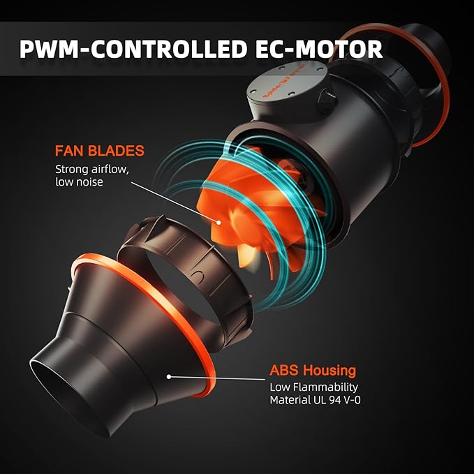 - Powerful Ventilation System: Quiet and low noise (26.8 dB) 4” Inline fan 205 CFM airflow with RC412 activated carbon filter and flexible duct. Provides excellent air circulation and eliminates odors. Clip fan delivers airflow ranging from 0 to 2500 RPM, flexible rotation quick circulation cooling, and customizable 10 speeds for all plant growth stages.