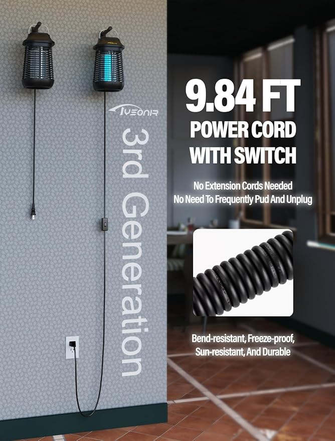 - 4. Convenient 3M Extended Power Cord with Switch Enjoy hassle-free setup with the 3-meter (9.8 ft) power cord and an easy-access switch located just 3.8 ft from the plug. Place it on a flat surface or hang it with the included hook—this zapper is designed for ultimate convenience.