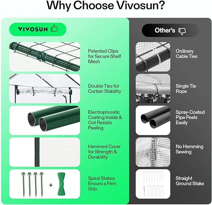 - Portable, Easily Stored: All accessories are included, so by following the step-by-step instructions, adults can easily set up our Vivosun green house without any other tools.When the season changes, it can be easily folded into a bag for storage and transport