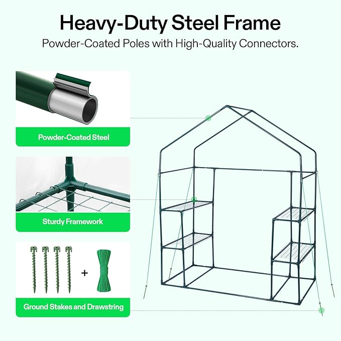 - Sturdy & Durable Framework: Supported by a powder-coated heavy-duty steel frame, our walk-in green house is very sturdy and strong.4 included tie-down ropes and stakes protect our hot house from being blown down by the wind, increasing its stability and safety