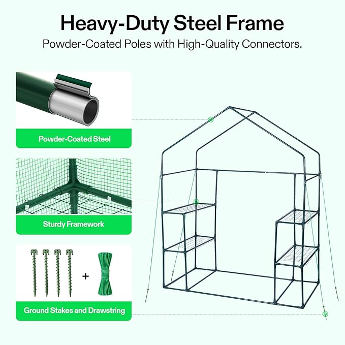 - Sturdy & Durable Framework: Supported by a powder-coated heavy-duty steel frame, our walk-in green house is very sturdy and strong.4 included tie-down ropes and stakes protect our hot house from being blown down by the wind, increasing its stability and safety