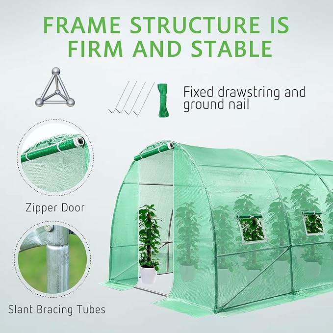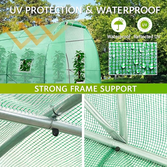 - Heavy-duty Galvanized Steel Frame: Supported by galvanized finish heavy duty steel frame, our tunnel green house is more durable and anti-rust than those whose frames are powder-coated