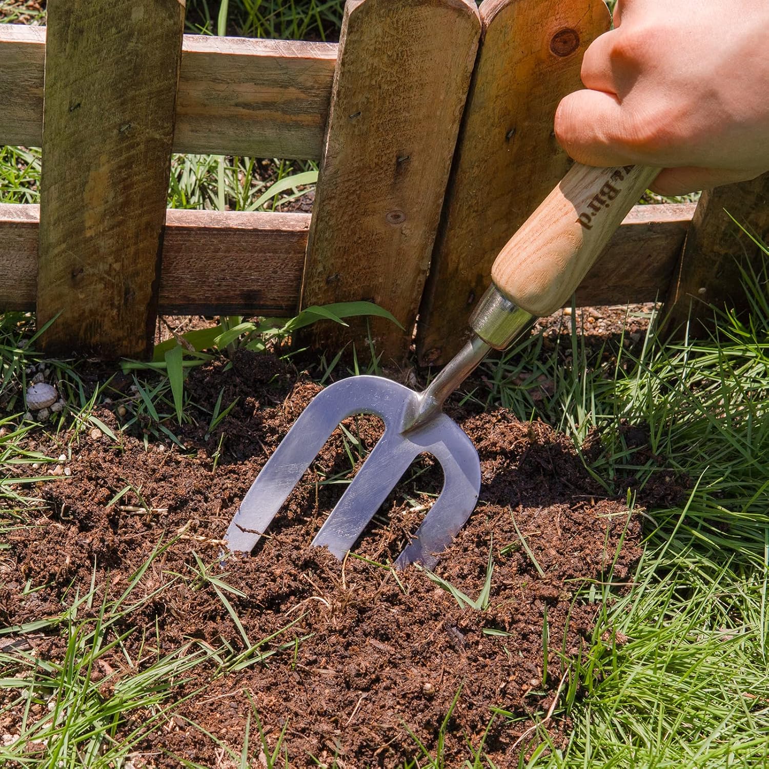 - WHAT YOU GET - 1 * Stainless Steel Hand Fork. Our garden forks are made by traditional manual process and can be used for more than 10 years. The more the wooden handle and stainless steel will be used, the smoother it will be. Ideal for weeding, planting and farming on pots, beds and borders. In addition, it will become one of your favorite gardening tools and the best gift for your family or friends.