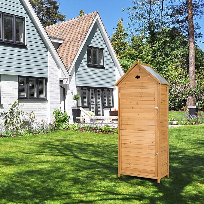 Goplus Outdoor Storage Shed, Lockable Fir Wood Garden Tool Storage Cabinet with Galvanized Sheet Roof for Garden, Yard, Natural Color