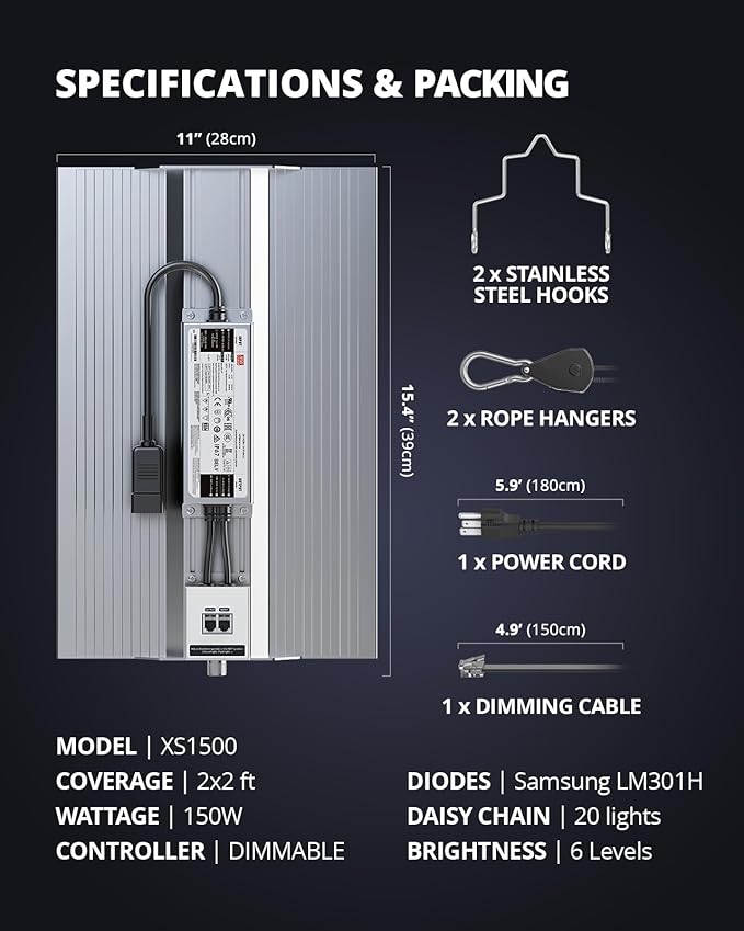 - Low Energy Low Costs: Compared to traditional 250W HPS/MH, XS1500 plant lights for indoor growing draws only 150W, boosts yields by 30% and cuts running costs; perfect for 3x3 ft veg & 2x2 ft flowering; adjust the height & brightness to suit plants' needs