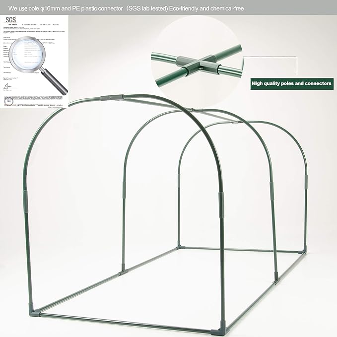 - DURABLE MATERIALS-The 600D cloth and PVC used in this product have been thickened, with good thermal insulation effect and stronger durability. The frames are all 16mm diameter thick steel tubes, the large wooden buttons are better fixed and rolled up door curtains, and the 6 7-shape ground tiles with a length of 15cm, which make the whole greenhouse more stable and greatly increase the wind resistance ability.