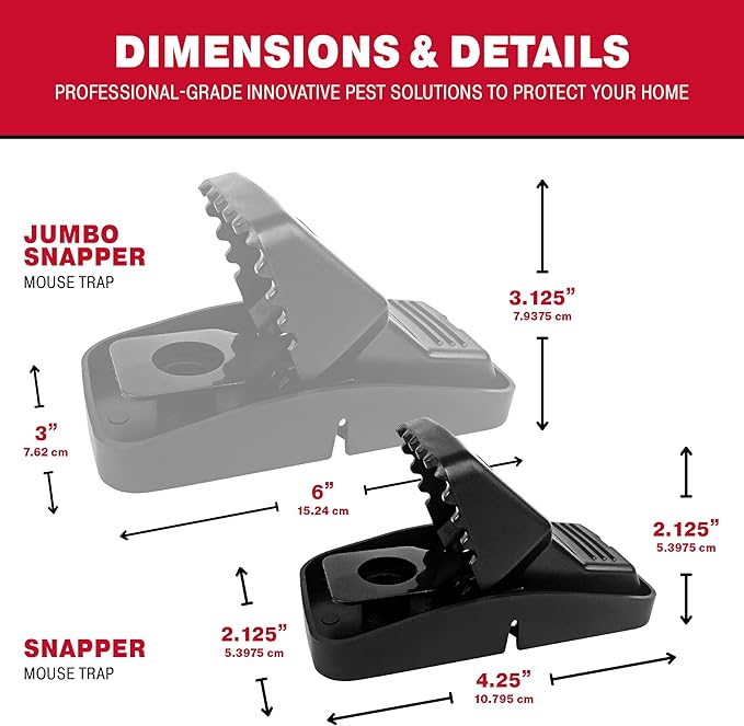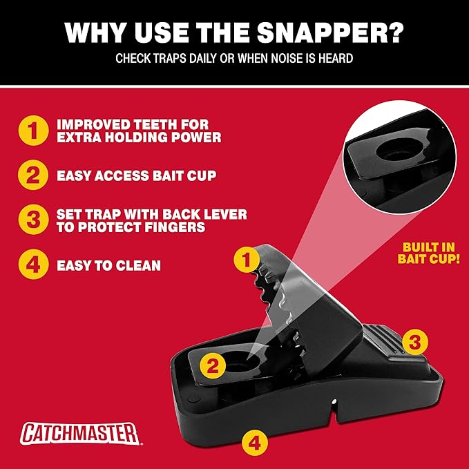 - HEAVY-DUTY: QUICK Kill: Snapper Mouse Traps are made from heavy-duty industrial-grade plastic with a powerful mouth and gripping teeth that close with great force and instantly kill the mouse. The Snapper rodent trap was designed with specific trigger sensitivity for a fast and effective snap.