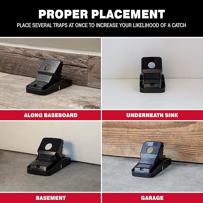 - SUPER QUICK SETUP: Simply put mouse bait in the mouse trap and push back on the lever to lock into the set position. No more worrying about snapping fingers while setting indoor or outdoor mouse traps. Be sure to place mice traps with trigger side against walls. Never place fingers near the trigger when the trap is set.