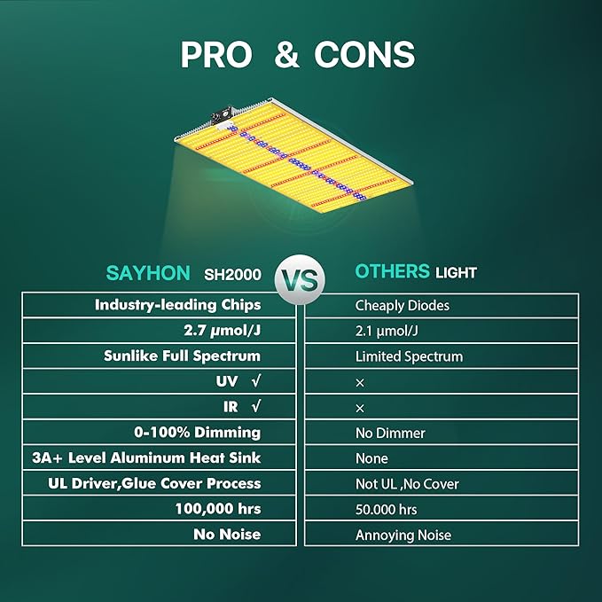 - ๐ฟ Ideal Cooling System: Full coverage 3A+ level aluminum heat sink can lower temperatures 50ยฐF greater than other brands, Sayhon led grow light maintain brightness at 95%+ after 3 years of use.