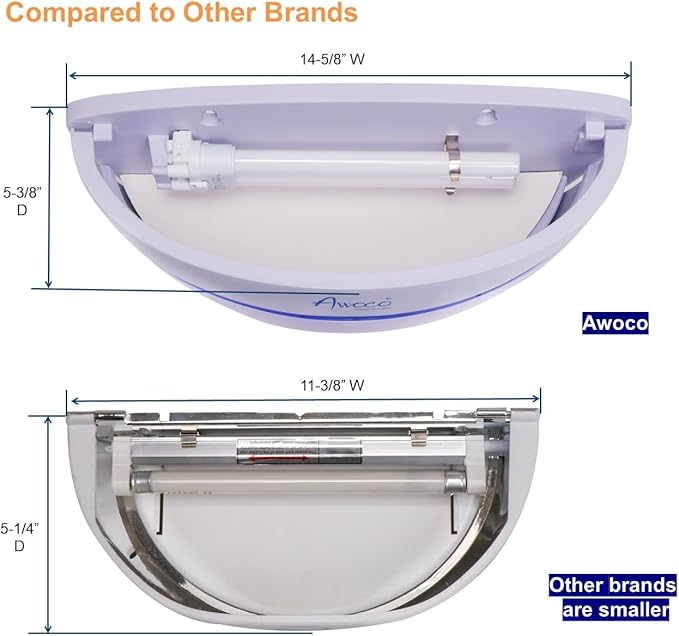 - [1 Year USA Limited Warranty on Fly Trap] - LED bulb is consumable depending on power condition which is a 3 months warranty. If the lightbulb fails within 3 months, contact us for a free LED bulb replacement limited to USA only. Awoco has LED bulbs and glue boards available. Lamp Overall Dimensions: 14-5/8"W x 5-3/8"D x 7-5/8"H. Glue Board Dimensions: 12-1/4" x 4-1/4".