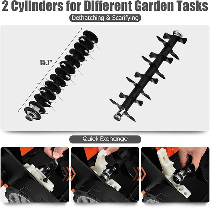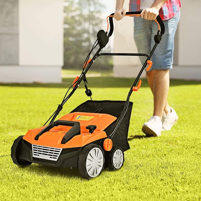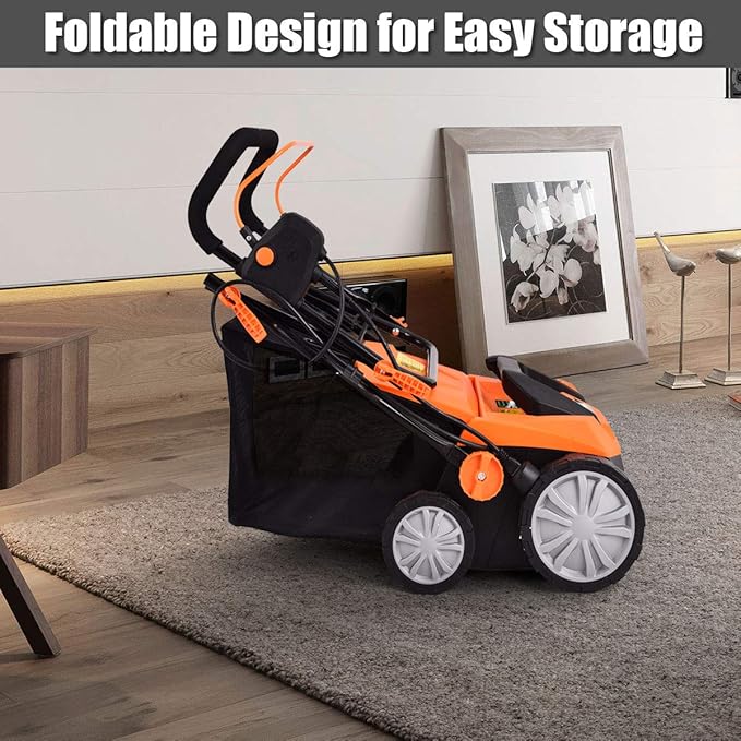 - 【2-In-1 Dethatcher & Scarifier】Equipped with a powerful 13 amp motor, this dual-function electric lawn mower can rack 15" path to get the heavy mowing and scarifying job done at fast speed. And you can easily change the cylinders in a few minutes. Besides, this machine has a 13.5 gallon collection bag to gather weeds automatically.
