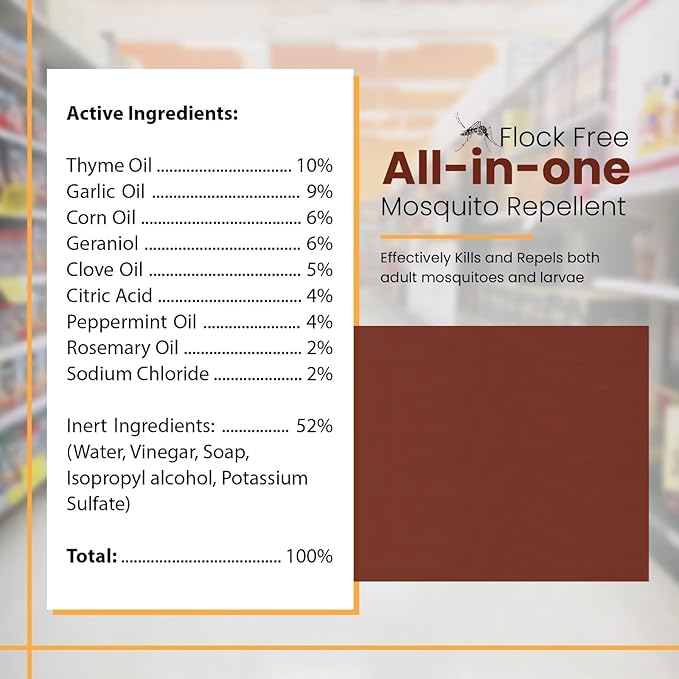 - Effective Mosquito Control: Flock Free Mosquito Control Repellent Spray is a powerful solution that not only kills and repels adult mosquitoes but also targets larvae and other insects such as ticks, fleas, flies, gnats, and chiggers, providing comprehensive protection against these disease-carrying pests.