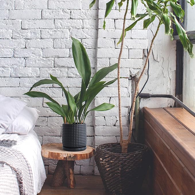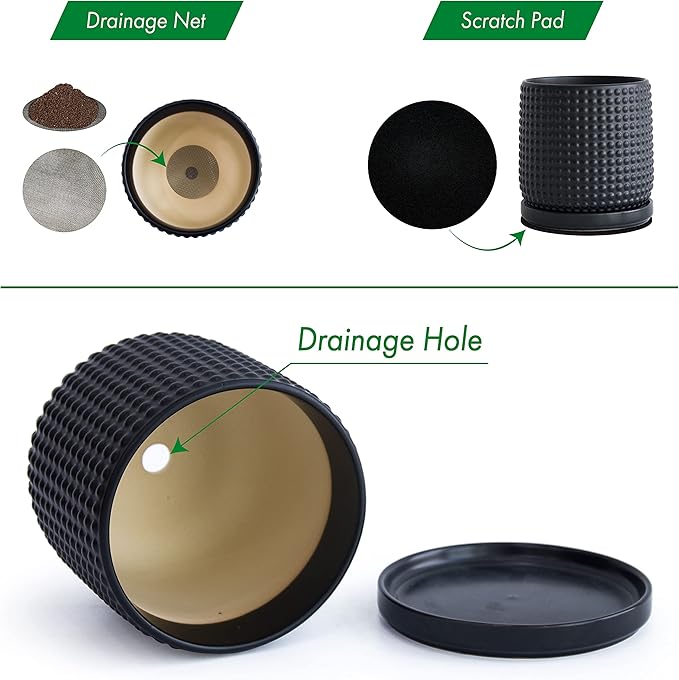 D'vine Dev 6 Inch Ceramic Beaded Stoneware Planter Pot - Flower Pot with Drainage Holes and Saucers for Indoor Succulent Plants or Flowers, Ebony Matte, 27-C-X-6