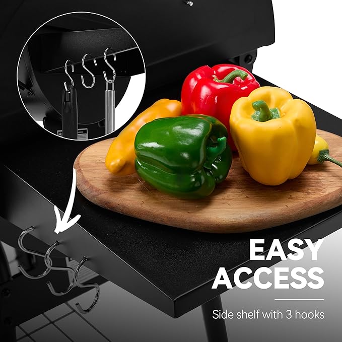 - Ample Space: Front and side tables offer workspace for seasonings and grilling tools. The bottom shelf provides extra storage space and holds up to only 20 lb. accessories when they are evenly distributed.