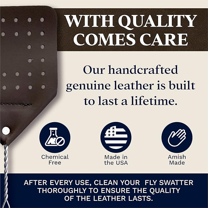 - Heavy-Duty Leather Paddle: This durable large fly swatter is handmade by Amish artisans using premium leather. The giant fly swatter also has a thick leather handle cover that’s bound to the spring-steel handle with a brass rivet. Our Amish big fly swatter will stand up to the biggest bugs and produce a powerful swat.