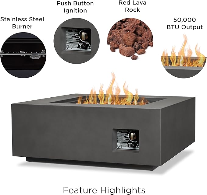 Real Flame Aegean 36”in Square Propane or Natural Gas Fire Pit Table, 50,000 BTU, Powder-Coated Steel, Push-Button Ignition, CSA Certified, Lava Rock, Storage Cover, Stainless Steel Burner with Lid