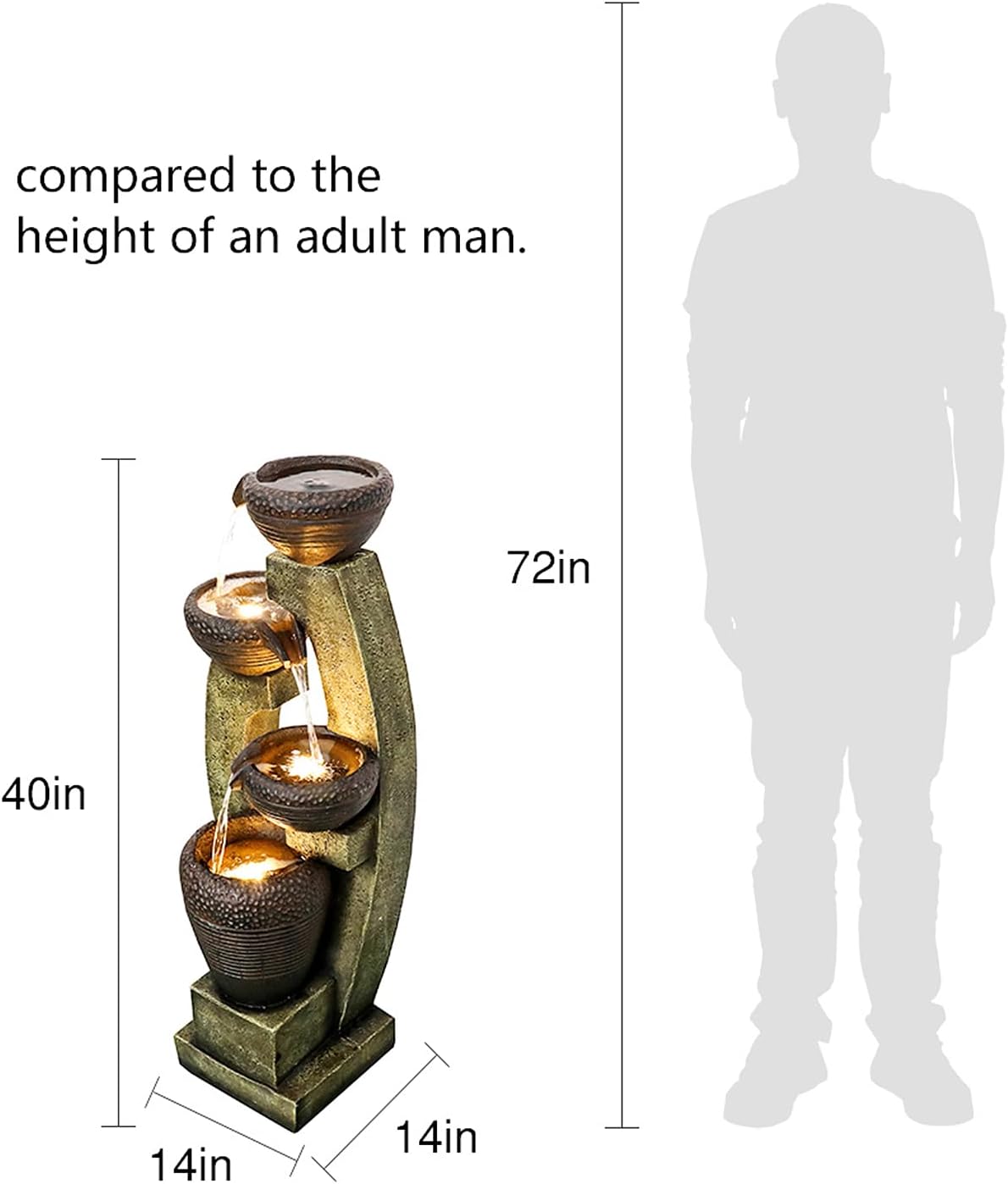 - With the suitable size 14" L x 14" W x 40" H for indoor or outdoor décor. The modern cascading bowls water fountain will add instant beauty to your surroundings.