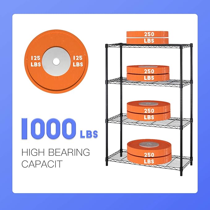 - HEAVY-DUTY LOAD CAPACITY: This metal shelf supports up to 1000 lbs total (250 lbs per shelf), making it ideal for garage shelving, pantry shelves, and heavy duty shelving applications.