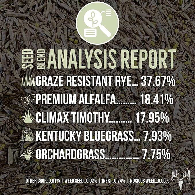 - Seed mixture of premium alfalfa, Kentucky bluegrass, heavy graze rye, timothy grass & orchard grass.